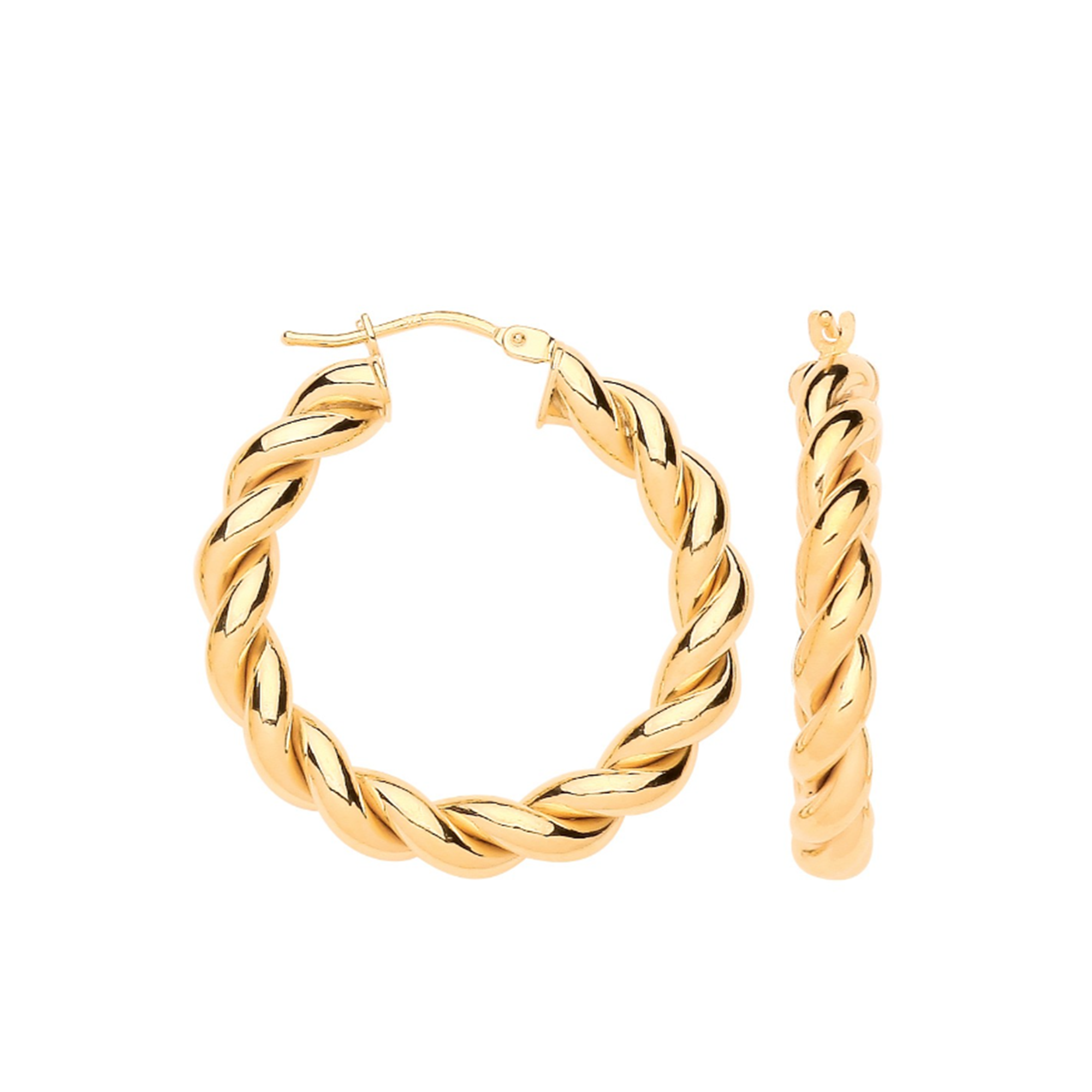 These earrings feature a captivating twist design, crafted from premium 9ct gold. The hollow construction allows for a bold 30mm size without the weight, ensuring comfort throughout the day. The intricate twist pattern catches the light beautifully, creating a dazzling effect that enhances their elegant appeal.