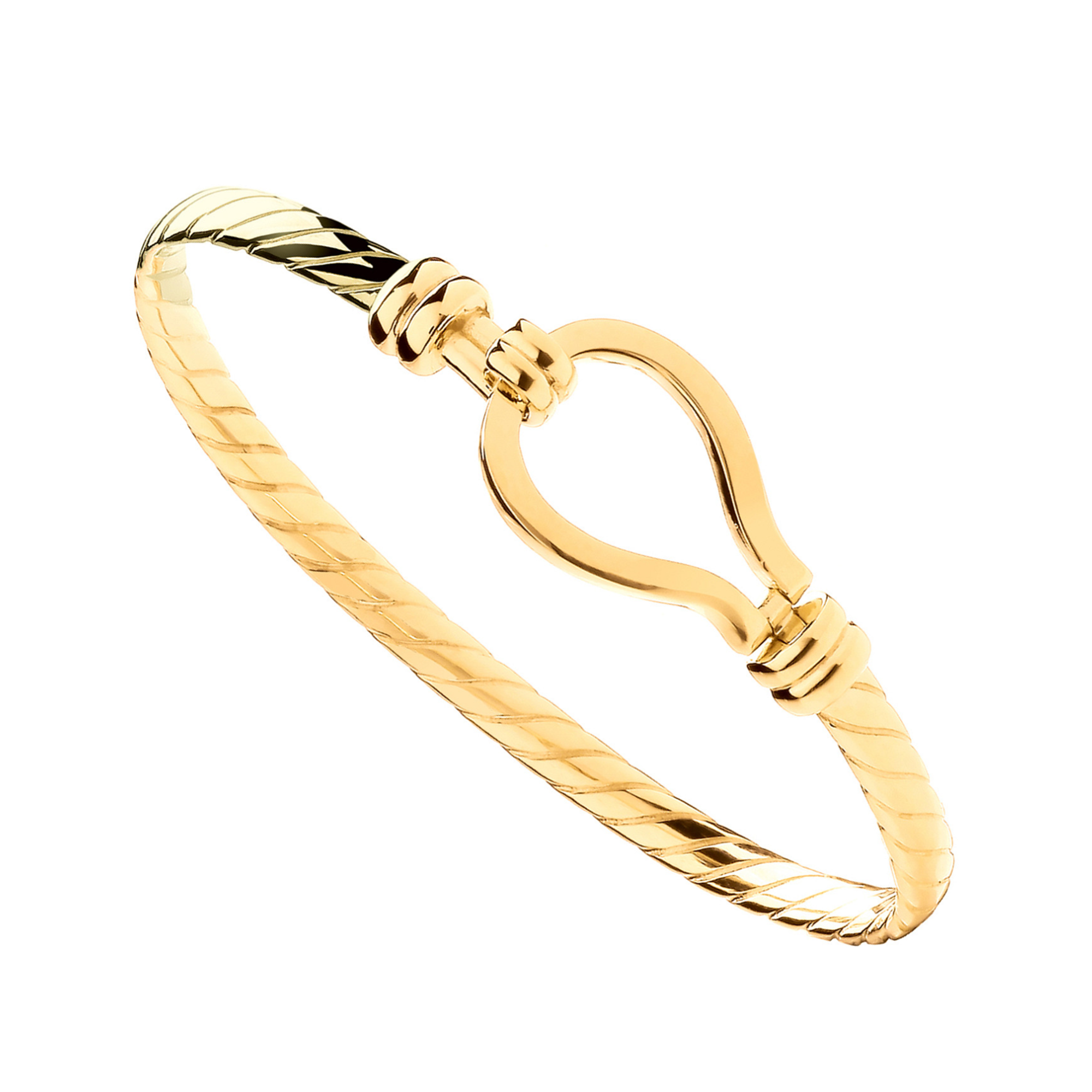 Expertly crafted from high-quality 9ct gold, this bangle combines durability with refined elegance. The hook closure not only provides a secure fit but also adds a unique design element that sets this bangle apart from traditional styles. The bangle’s solid construction ensures that it will maintain its shape and shine over time, making it a lasting piece in your jewelry collection.