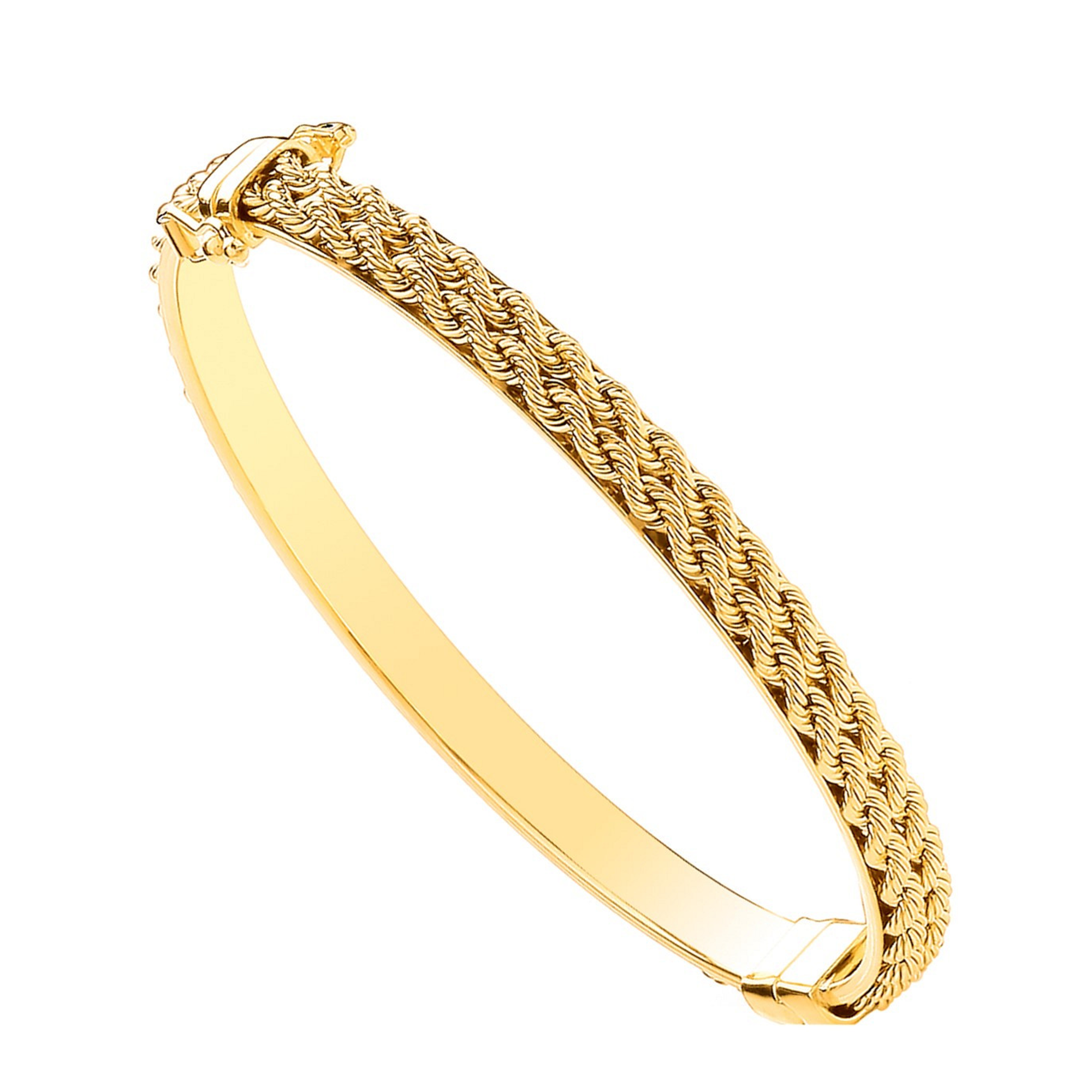 The bangle showcases a stunning 5.3mm wide rope chain pattern, intricately designed to create a twisted effect that spirals around the wrist. This hollow bangle captures the essence of elegance and sophistication, with each twist reflecting light to enhance the rich, golden hue of the 9ct gold. The design is both intricate and eye-catching, making it a standout accessory that adds a touch of luxury to any outfit.