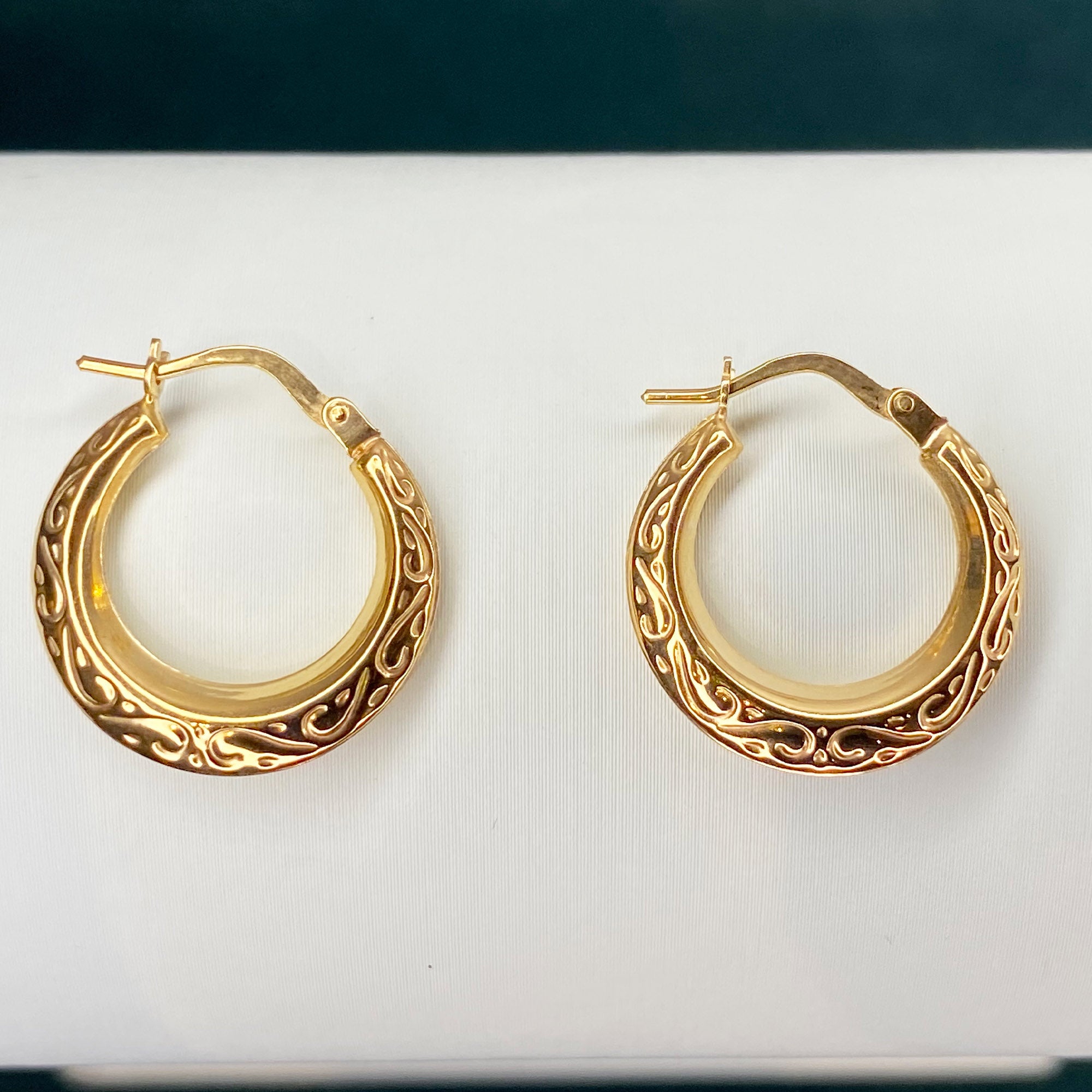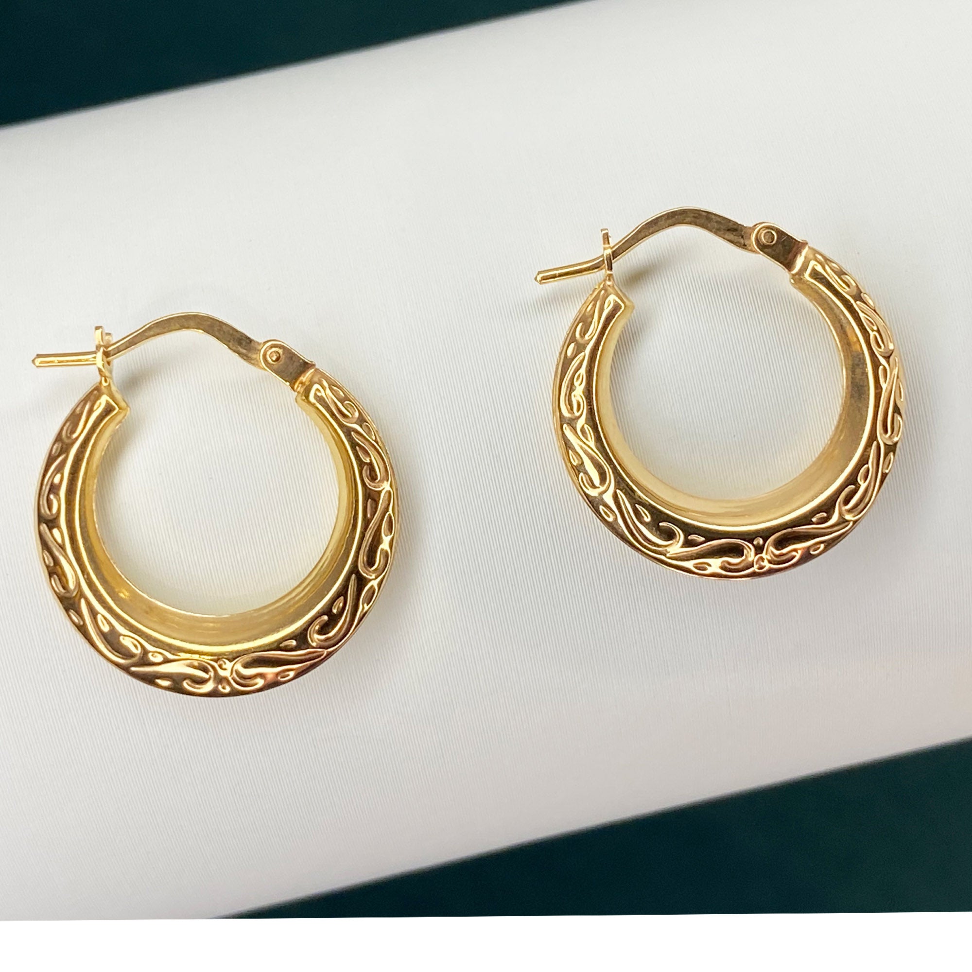Material and Design: Made from genuine 9ct solid gold, these creole earrings feature a sophisticated fancy pattern, adding a touch of sophistication and charm. The patterned detailing enhances their visual appeal, catching the light and creating a subtle sparkle. Whether you choose the 20mm size for a bolder statement or the 14mm size for a more delicate look, these earrings exude refined elegance.