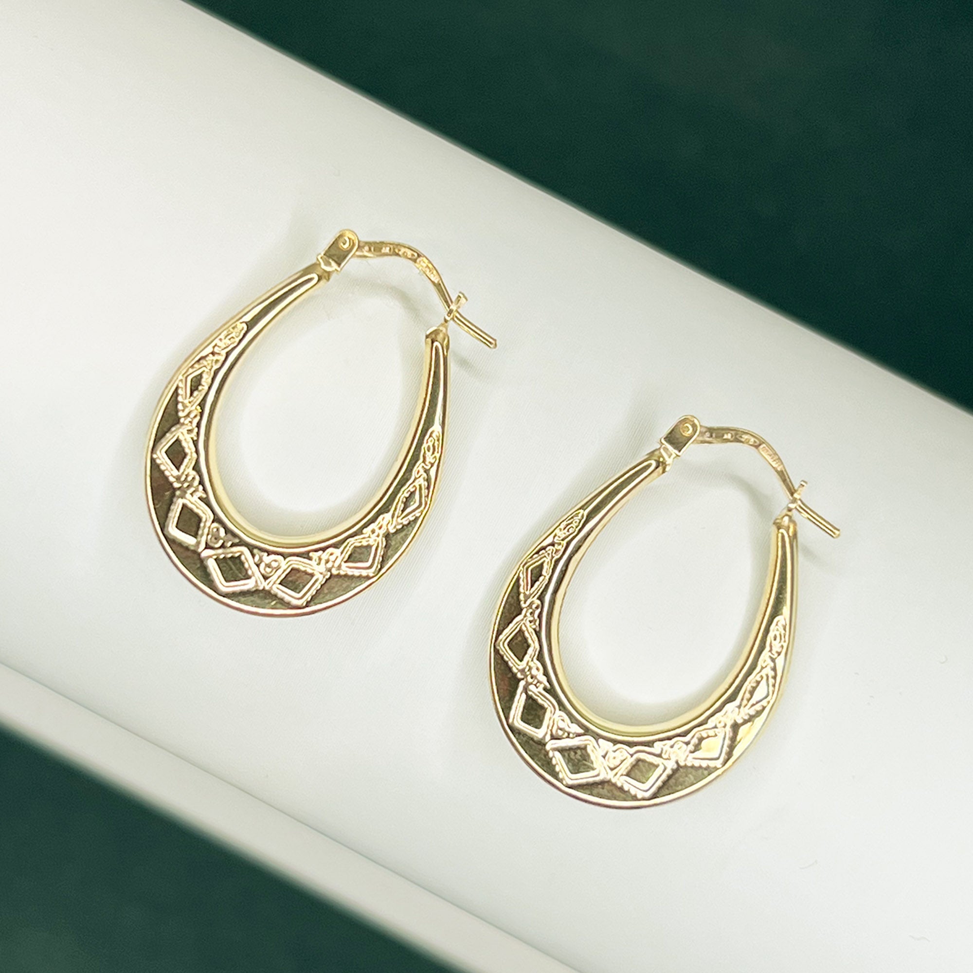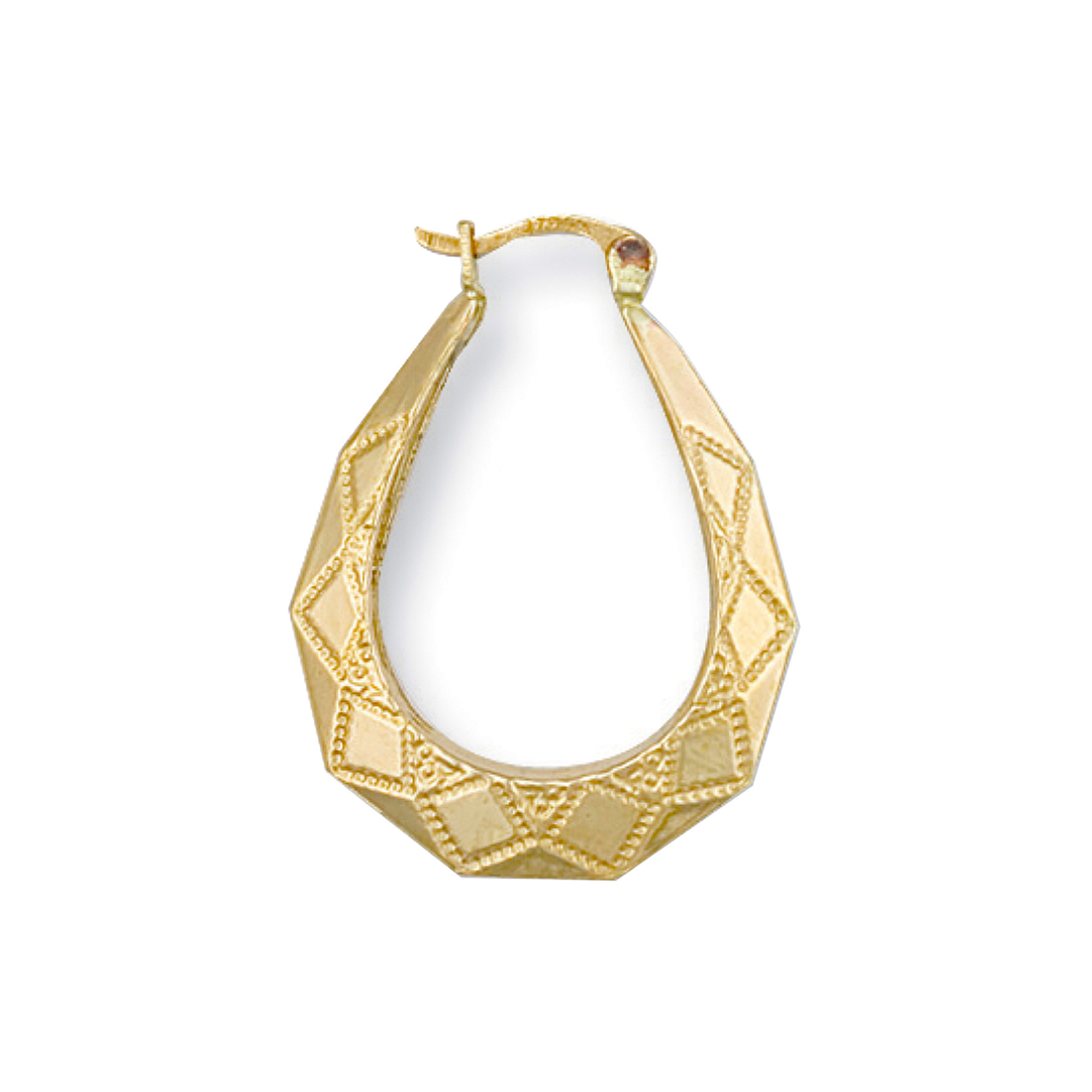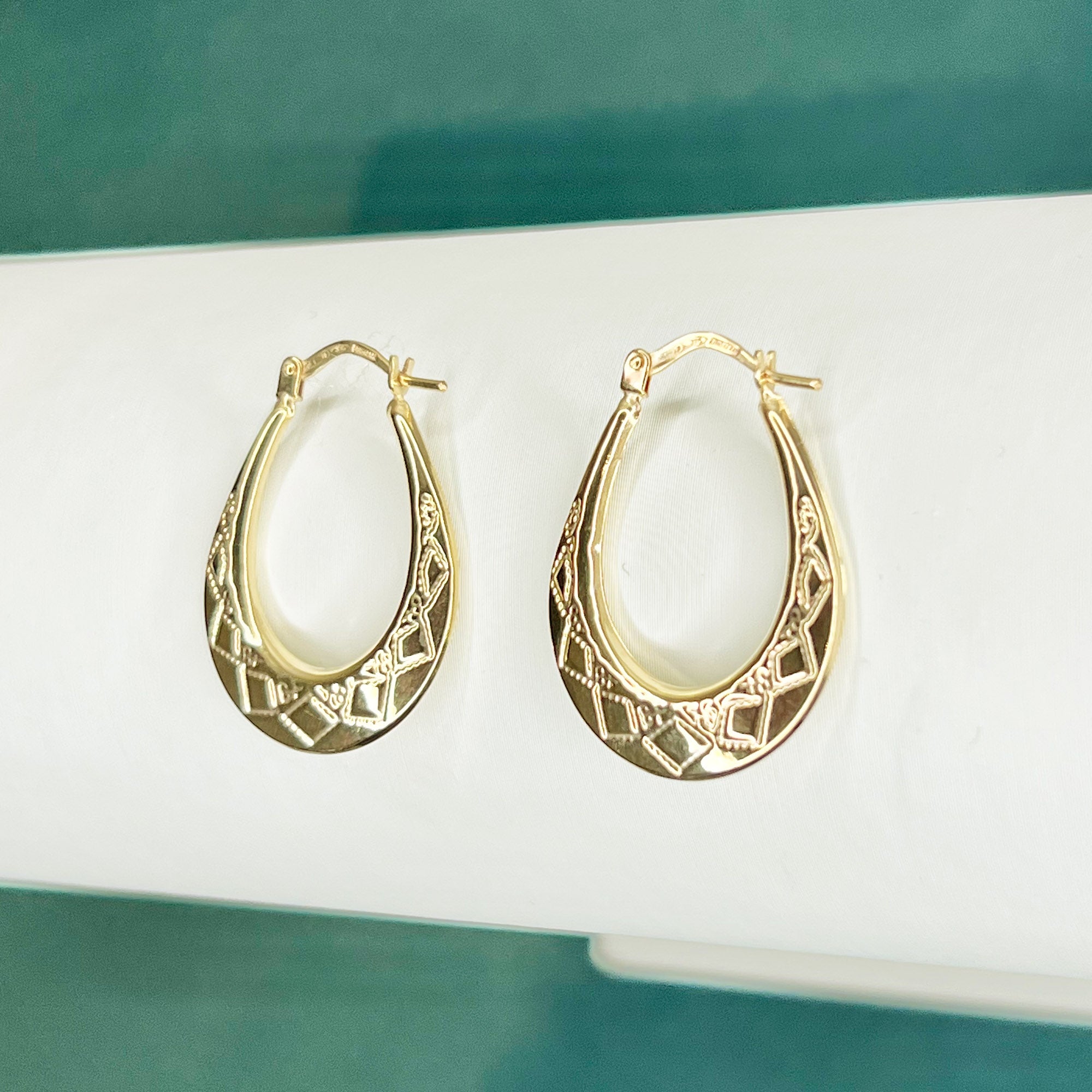 Versatile Elegance: These 9ct Solid Gold Diamond Cut Oval Creole Earrings are incredibly versatile, effortlessly enhancing your style whether you're heading to a special event or adding a touch of sophistication to your everyday look. Their oval shape and diamond-cut pattern make them a perfect choice for those who appreciate classic designs with a modern twist. These earrings are sure to become your go-to accessory for any occasion.