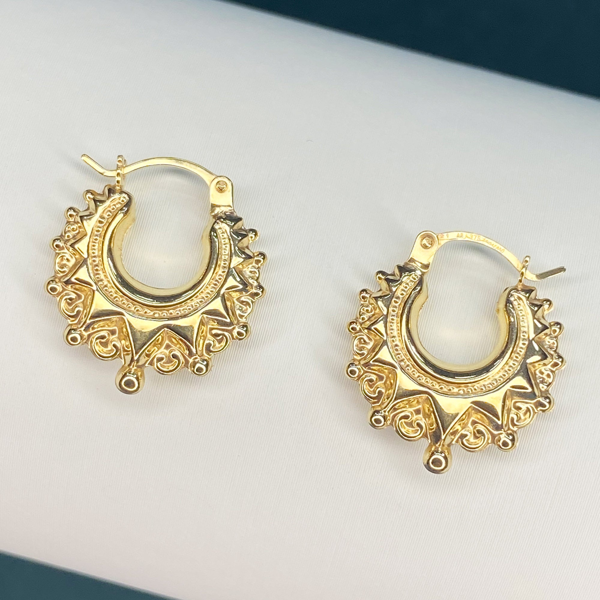 Material and Design: Made from genuine 9ct solid gold, these fancy creole earrings boast a brilliant shine and a traditional yet ornate design. The 16mm width creates a charming silhouette, making them suitable for various occasions. The intricate detailing adds a touch of sophistication, enhancing their visual appeal and adding a subtle elegance to your ears.